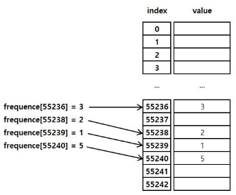 하지만 전체 키 중 실제 사용되는 키의 개수가 적을 경우 메모리 효율성이 크게 떨어집니다.