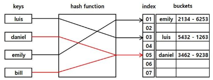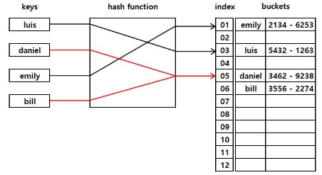 아래 그림은 이름-전화번호를 매핑하기 위한 해시함수를 개념적으로 나타냈습니다.