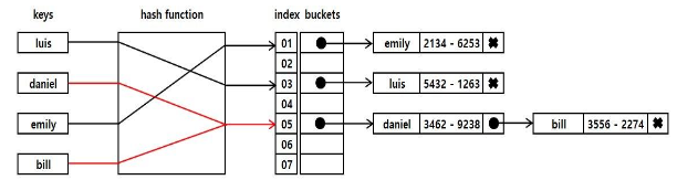 예시의 해시 함수는 ‘daniel’과 ‘bill’를 모두 ‘05’로 매핑해 해시충돌을 일으키고 있습니다.