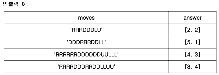 매개변수 moves에 청소 로봇에 명령을 내린 문자들이 차례대로 나열된 명령 문자열이 주어지 면 이 명령 문자열을 청소 로봇이 모두 수행했을 때 최종 위치를 반환하는 프로그램을 작성하 세요. 격자판 밖으로 벗어나는 명령은 주어지지 않습니다.