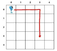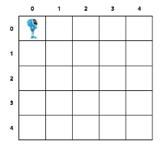 이차원 배열 격자판 0행 0열에 로봇이 3시 방향을 보고 있습니다.