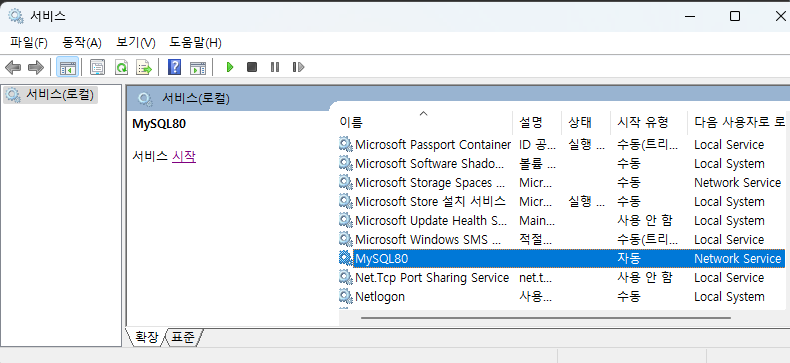 그리고 다시 서비스로가서 mysql 서비스를 시작한다.