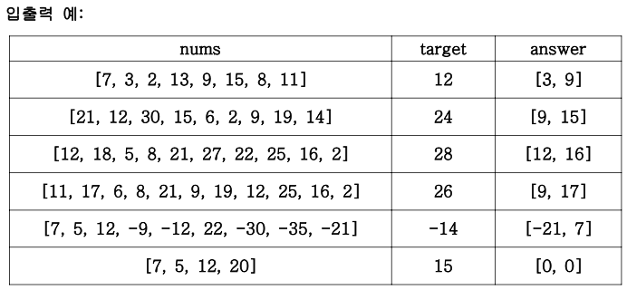 매개변수 nums에 길이가 n인 수열이 주어지고, 매개변수 target에 자연수 값이 주어지면 이 수열안에서 두 개의 원소의 합이 정수 target값이 되는 두 원소를 구해 배열에 오름차순으로 담아 반환합니다.