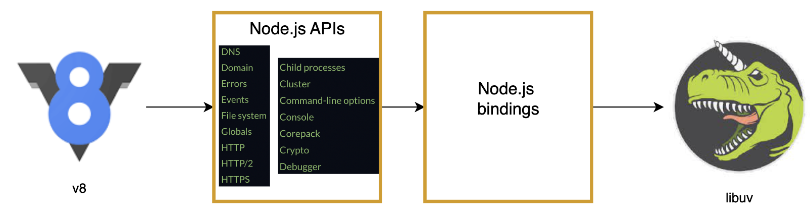 v8이 코드를 해석하고 Node.js APIs들 중 하나의 함수를 호출하고 Node.js 바인딩을 통해서 libuv에 의해서 원하는 작업을 처리하게 한다.