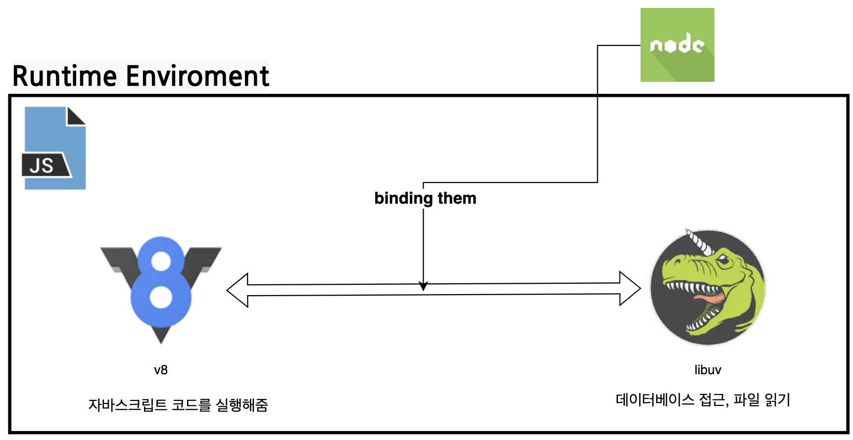 또한 Node.js는 자바스크립트 코드를 실행시켜주는 V8엔진과 자바스크립트 코드를 읽는것 이외의 데이터베이스 접근, 파일 읽기 등등의 처리를 하는 libuv를 바인딩 해준다.