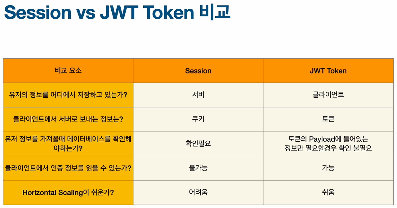 - 데이터베이스에 Session를 저장해야하기 때문에 Horizontal Scaling이 어렵다.