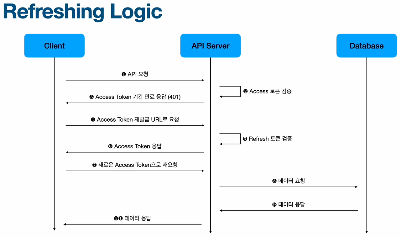 - 사용자는 Access Token과 Refresh Token을 둘 다 서버에 전송하여 인증하고 만료됐을 시 후자로 새로운 Access Token을 발급받는다.