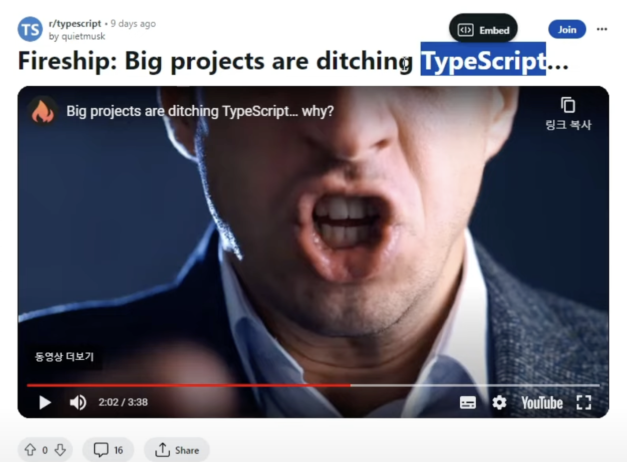 또한 Svelte4(프론트엔드 프레임워크)에서도 타입스크립트를 버린다고 한다.