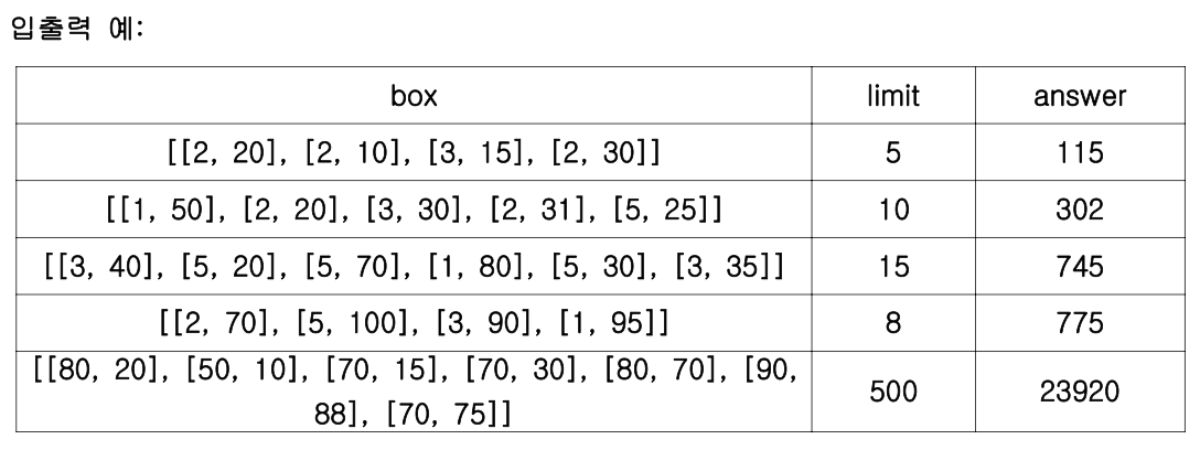 매개변수 box에 각 박스 종류의 정보가 주어지고, limit에 트럭의 실을 수 있는 박스의 최대 개수가 주어지면 트럭에 실을 수 있는 사과의 최대 개수를 반환하는 프로그램을 작성하세요.