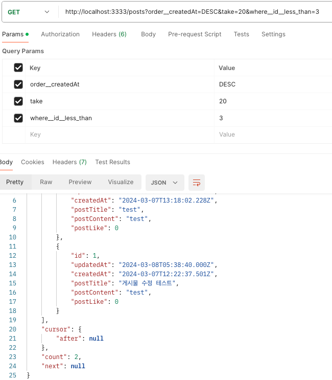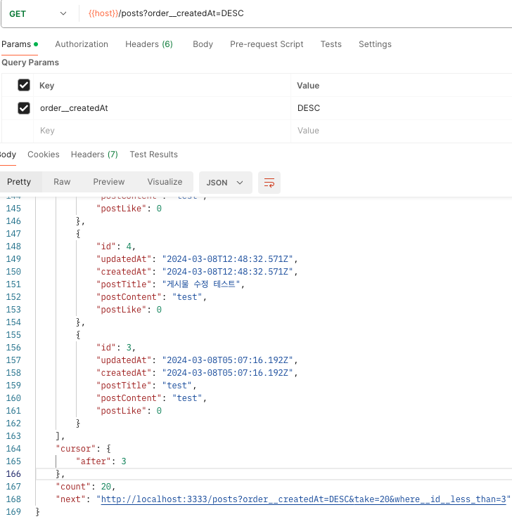 그럼 이제 내림차순 또한 다음 페이지를 조회 하기 위한 nextURL와 cursor가 잘 나온다.