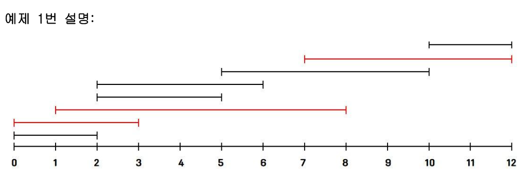 print(solution(12, [[5, 10], [1, 8], [0, 2], [0, 3], [2, 5], [2, 6], [10, 12], [7, 12]]))