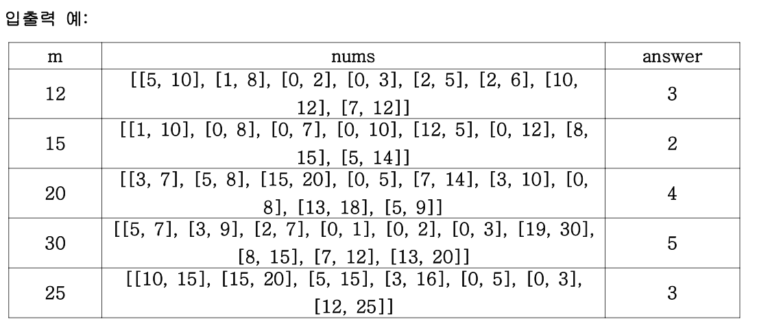 • nums[i][0]은 i번째 선긋기의 시작 점, nums[i][1]은 i번째 선긋기의 끝점입니다. • 0 <= nums[i][0] < nums[i][1] <= 10,000