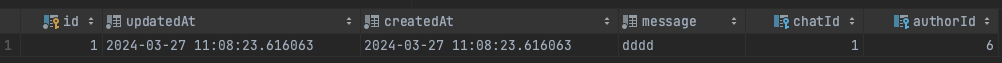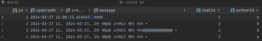 그럼 이제 해당 메세지가 있는 채팅방과 작성자와 내용이 DB에 잘 저장이 된다.