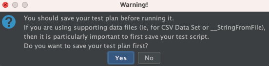 그리고 상단 왼쪽에 초록색 실행 버튼을 누르면 아래와 같이 해당 테스트 정보를 파일로 저장할 것이냐는 알림이 뜬 후 실행이 된다.
