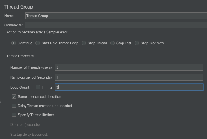 - Thread Group : 테스트에 사용될 쓰레드 개수, 쓰레드 1개당 사용자 1명