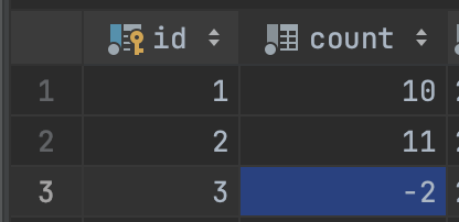 사용자의 요청 순서대로 처리는 되지만 데이터베이스의 count값이 -2로 바뀌어져 있다.