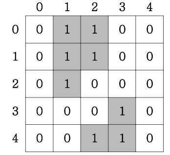 print(solution([[0, 1, 1, 0, 0], [0, 1, 1, 0, 0], [0, 1, 0, 0, 0], [0, 0, 0, 1, 0], [0, 0, 1, 1, 0]]))