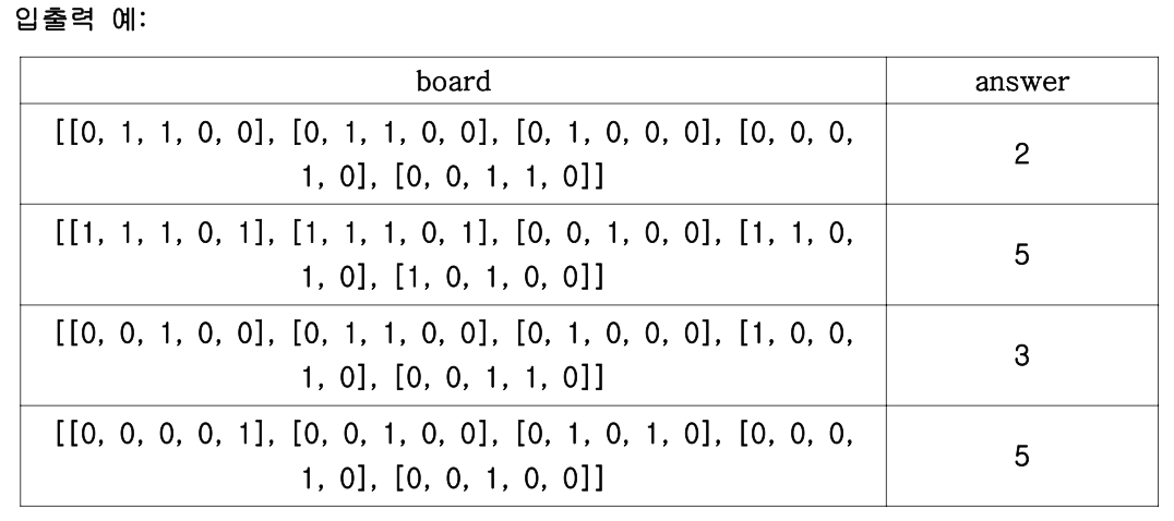 매개변수 board에 모니터 화면의 격자정보가 주어지면 검정색으로 칠해진 영역은 총 몇 개가 있는지 구하여 반환하는 프로그램을 작성하세요.