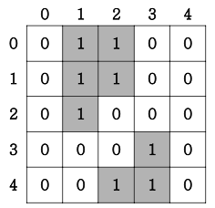 print(solution([[0, 1, 1, 0, 0], [0, 1, 1, 0, 0], [0, 1, 0, 0, 0], [0, 0, 0, 1, 0], [0, 0, 1, 1, 0]]))