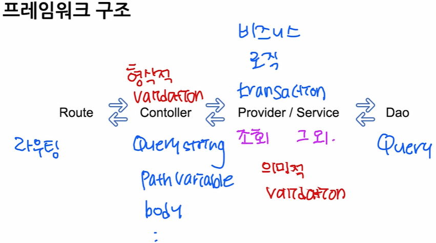 Route : requset가 오면 해당 url 요청에 맞는 controller로 연결 Controller : 형식적 validation, querystring,path variable,body를 받아서 전달 provider(조회)/service(그외):비지니스로직, transaction, 의미적 validation(DB를 거친다) Service의 경우 Dao에게 같은 파라미터를 넘겨줘서 실질적 쿼리를 실행한다. Dao: Query작성 및 실행, Get메소드 ==> 무언가를 조회 할 때 사용이 된다. 클라이언트는 서버에서 어떤 정보를 주어야 할까? ==>어떤 정보를 조회 할것인지 서버에게 주어야한다. 대표적으로 querystring을이용 회원가입을 할때는 id,비밀번호,휴대전화번호, 이름 들을 보내야한다..